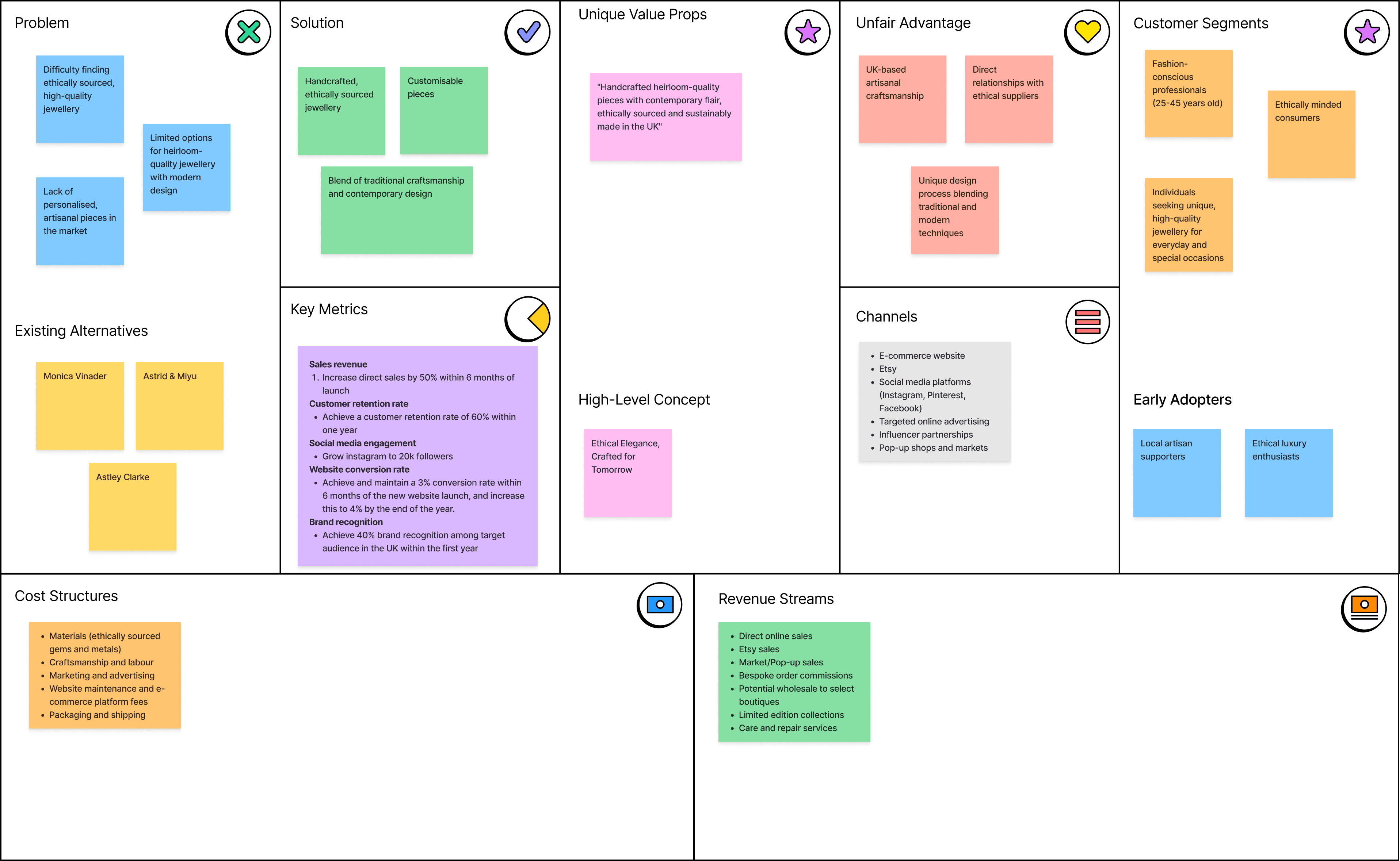 Create a cohesive branding strategy to establish Sierra Jewellery as a standalone luxury brand, moving beyond the Etsy marketplace. To fulfil this brief I met with the client and filled out the lean canvas together, so that I could understand the business and have the client think about how the business's strategy fits with the design goals.